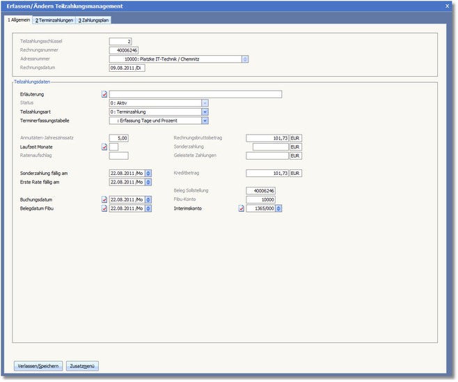 Die Erfassung der Termine erfolgt in Tagen ab Rechnungsdatum und die einzelnen Raten werden als absoluter Wert (Betrag) eingetragen.