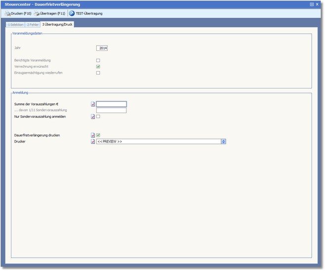 Mit einem Klick auf diesen Symbolbutton haben Sie die Möglichkeit, sich über einen Probedruck die Dauerfristverlängerung anzeigen zu lassen, ohne eine Datenübertragung zu starten.