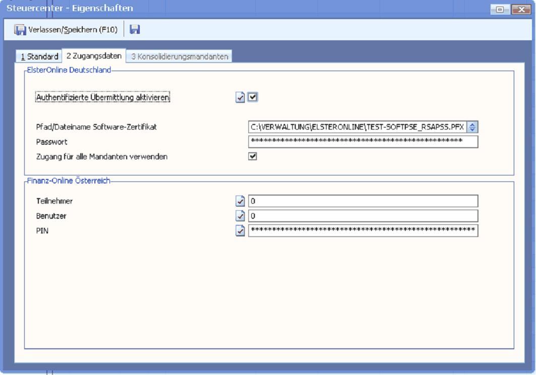 Die authentifizierte Übermittlung müssen Sie in jedem Mandanten über die Eigenschaften des Steuercenters aktivieren - unabhängig davon, ob Sie für jeden Mandanten einen eigenen ElsterOnline-Zugang haben oder nicht. |