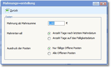Hier wird durch Aktivierung der entsprechenden Option festgelegt, welche "Offenen Posten" gemahnt werden sollen: