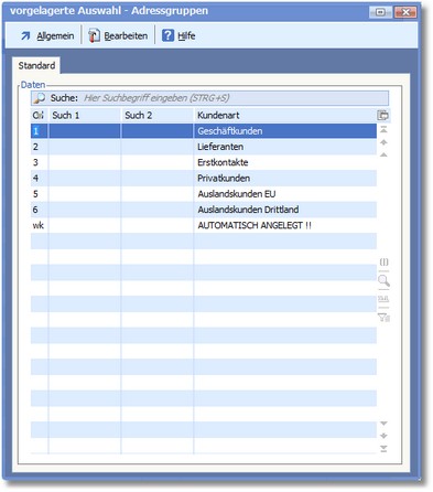 Das Programm öffnet die vorgelagerte Auswahltabelle der Adressgruppen.