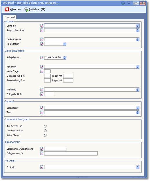 Wenn vom Lieferanten ein Belegrabatt gewährt wird, ist dieser hier zu hinterlegen.