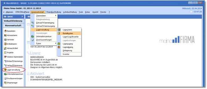 1. Klicken Sie mit der Maus im Hauptmenü auf „Warenwirtschaft > Lagerverwaltung > Bestellsystem".
