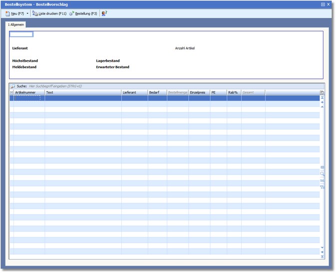 Das Programm öffnet eine leere Bestellvorschlagstabelle.
