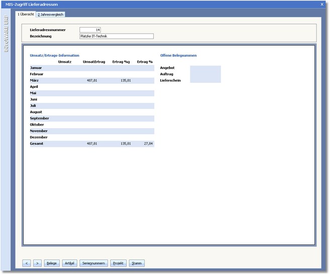 Auf der Karteikarte "Jahresvergleich" erhalten Sie Umsatzinformationen der Lieferadresse im laufenden Geschäftsjahr und Sie können dieselben mit den Umsätzen der Vorjahre vergleichen.