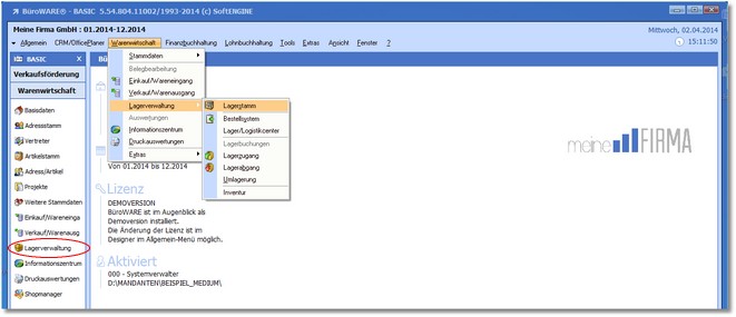 1. Klicken Sie mit der Maus im Hauptmenü auf  "Warenwirtschaft > Lagerverwaltung > Lagerstamm".