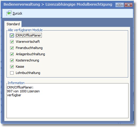 Im Informationsbereich sehen Sie die für das jeweilige Modul noch zur Verfügung stehenden Lizenzen und die Gesamtanzahl der erworbenen Lizenzen.