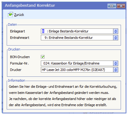 Um diese Verbuchung zu Erreichen, sollten Sie für diesen Vorgang jeweils eine eigene Entnahmeart (Anfangsbestand ist niedriger als Endbestand) und eine Einlageart (Anfangsbestand ist höher als Endbestand) anlegen und in die Maske eintragen. Jeder dieser beiden Vorgänge sollte dann ein eigener Artikel für die korrekte Verbuchung in der Finanzbuchhaltung zugeordnet werden.
