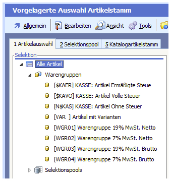 Warengruppen für die Artikel in den einzelnen Steuerarten. Diese Gruppen werden dann in der Warenwirtschaft mit angezeigt: