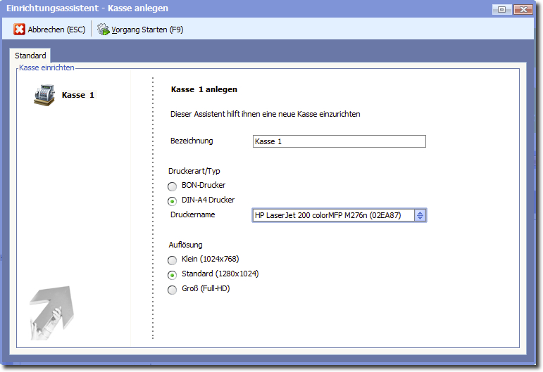 Für jede Kasse können eine eigene Bezeichnung, eigene Drucker und die entsprechende Auflösung festgelegt werden.