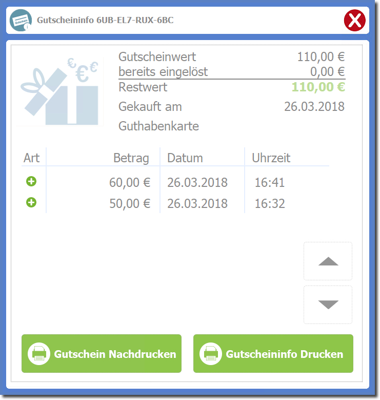Sie erhalten dann eine Anzeige der Gutscheinhistorie und können diese auch direkt ausdrucken.
