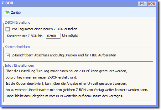 Um dass zu erreichen, wird die Option "Pro Tag immer einen neuen Z-BON erstellen" deaktiviert.