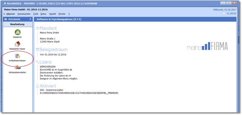 Im Arbeitsplatz des Kassensystems finden Sie die Verknüpfung "Artikelstammdaten", mit welcher Sie die Artikelauswahltabelle der Warenwirtschaft aufrufen können.