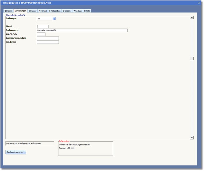 Wählen Sie für die Buchung der manuellen Normal-AfA die Buchungsart 23: