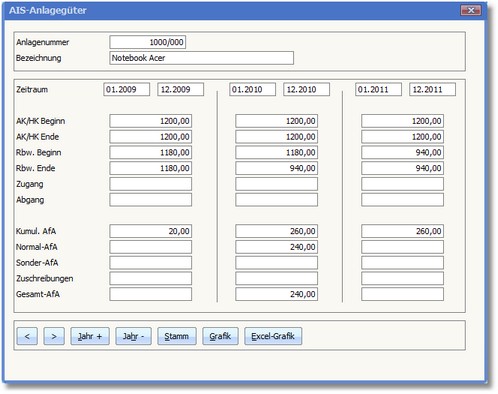 Die Maske zeigt jeweils drei aufeinander folgende Wirtschaftsjahre. Für jedes eingeblendete Wirtschaftsjahr werden die errechneten Anlagewerte angezeigt. Über den Button <Jahr+> wird die Anzeige um ein Wirtschaftsjahr nach vorne verschoben, der Button <Jahr-> verschiebt die Anzeige wieder um ein Wirtschaftsjahr zurück.