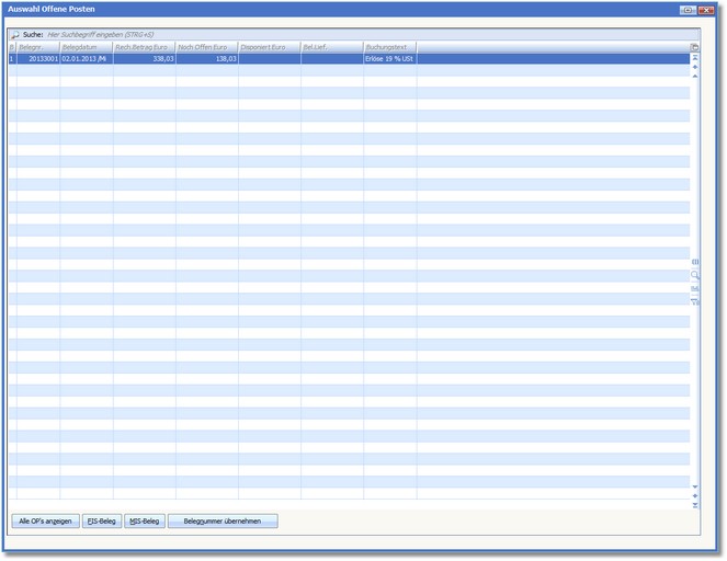 << Hier KLicken um eine Inhaltsübersicht anzuzeigen >> Navigation: Finanzbuchhaltung > Stapelbuchungen > Die Karteikarte "Buchungen" > Buchen von Zahlungsein- und -ausgängen > Die Single-OP-Auswahltabelle |