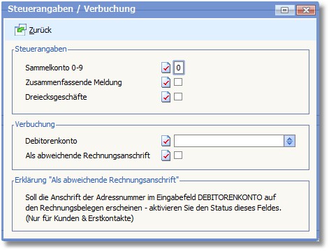 << Hier KLicken um eine Inhaltsübersicht anzuzeigen >> Navigation: Finanzbuchhaltung > Stammdaten > Personenkonten > Die Karteikarte "Adressauswahl" > Adressen erfassen/ändern > Personenkonten bearbeiten - Menü > Steuerangaben / Verbuchung |