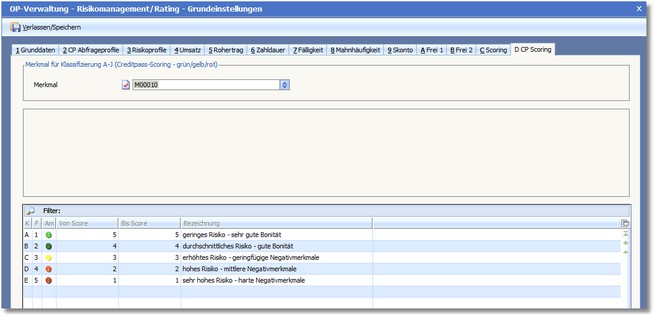 << Hier KLicken um eine Inhaltsübersicht anzuzeigen >> Navigation: Finanzbuchhaltung > OP-Verwaltung > Debitorenkennzahlen/Rating > Debitorenrating einrichten > Die Karteikarte "CP Scoring" |