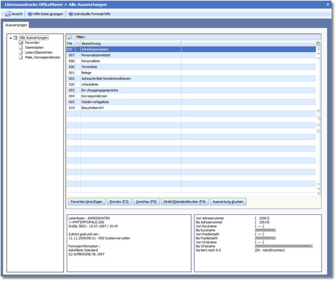 Das Programm öffnet den Dialog "Listenausdrucke OfficePlaner > Alle Auswertungen".