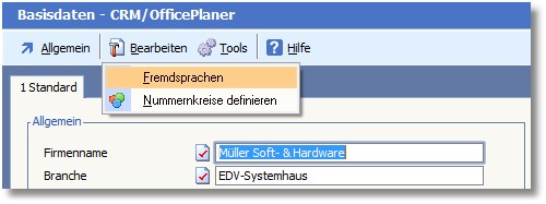 1. Klicken Sie mit der Maus in der Menüleiste der CRM-Basisdaten auf "Bearbeiten > Fremdsprachen".