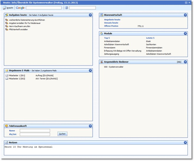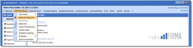 1. Klicken Sie mit der Maus im Hauptmenü auf "CRM/OfficePlaner > Heute Info/Übersicht".