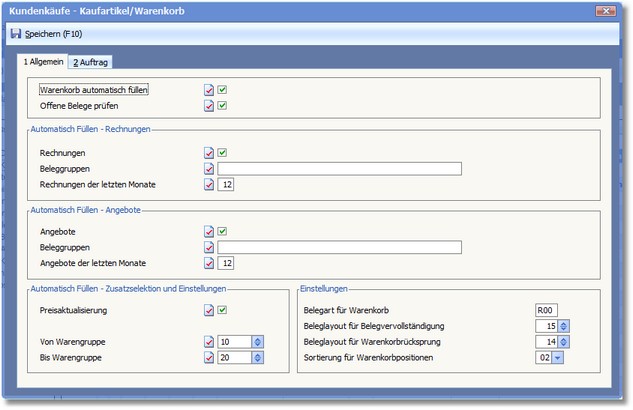 Im Dialog "Kundenkäufe - Kaufartikel/Warenkorb" müssen alle Einstellungen für den Inhalt des Warenkorbs hinterlegt werden. Beim Aufruf des Warenkorbs werden diese Einstellungen geprüft und mit den Kundendaten (z.B. Rechnungen etc.) aktualisiert. Der Warenkorb wird nun automatisch mit den neuesten zur Verfügung stehenden Belegen gefüllt.