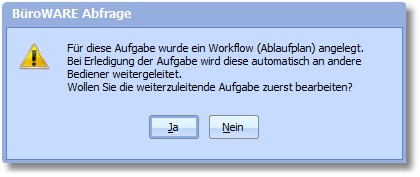 Der Bediener, welcher die Aufgabe gerade bearbeitet, erhält bei Kennzeichnung seines Aufgabenteils als "erledigt" die Meldung, dass die Aufgabe an den nächsten Bediener weitergeleitet wird.