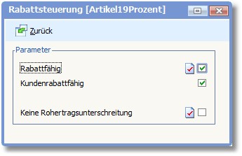 << Hier KLicken um eine Inhaltsübersicht anzuzeigen >> Navigation: Warenwirtschaft > Stammdaten > Artikelstamm > Artikel erfassen/ändern > Artikel erfassen/ändern - Menüleiste > Rabattsteuerung |