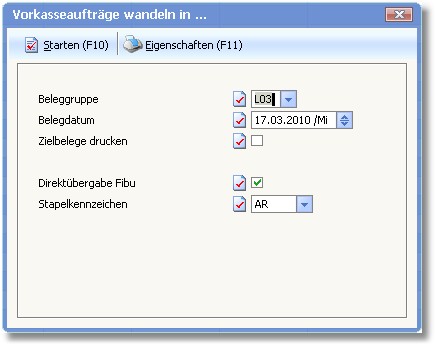 Aktivieren Sie den Status þ dieses Feldes, wenn die erstellten Rechnungsbelege direkt an die Fibu übergeben werden sollen.  Das Programm verbucht die Rechnungen und verrechnet automatisch die auf dem Kundenkonto gebuchten erhaltenen Anzahlungen (Vorkasse) auf die neu erstellten Rechnungen.