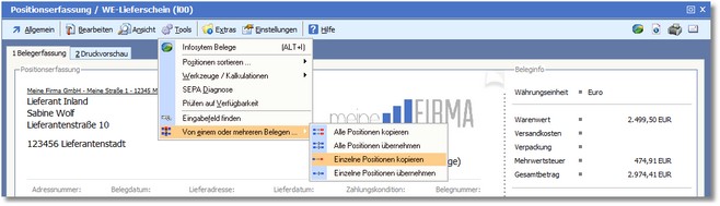 Von einem oder mehreren Belegen einzelne Positionen kopieren