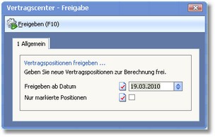 Über dieses Fenster können Sie den Vertrag oder neu in einen Vertrag aufgenommene Wartungs- oder Mietpositionen freigeben. Die Freigabe ist in jedem Fall erforderlich, damit die Positionen berechnet werden können (Erstberechnung und Folgeberechnungen) und erfolgt im Bearbeitungsdialog über den Menüpunkt "Extras > Vertrag/Nachtrag freigeben" oder über die Tastenkombination [SHIFT]+[F3].