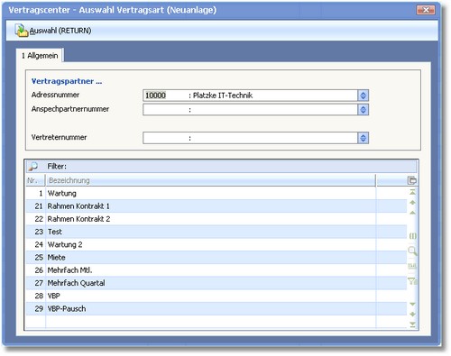 Um einen Vertrag anzulegen, wählen Sie in der Tabelle die zutreffende Vertragsart und bestätigen Sie Ihre Auswahl mit [RETURN] oder mit einem Klick auf den Symbolbutton <Auswahl>.