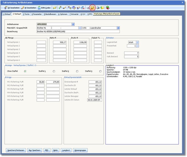 2. Wählen Sie den Drucker APRL00002 Brother HL-8050N(USB/PAR/LAN) aus und drücken Sie [RETURN], um die Fakturierung Artikelstamm zu öffnen.