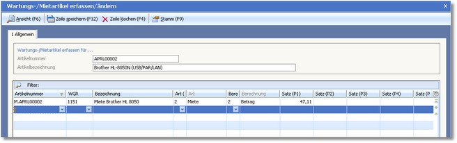 Das Programm öffnet eine Tabelle, in welcher Sie Miet- und Wartungsartikel anlegen und bearbeiten können.