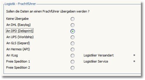 << Hier KLicken um eine Inhaltsübersicht anzuzeigen >> Navigation: Warenwirtschaft > Lagerverwaltung > Lager/Logistikcenter > Logistiker "DPD" (DELISprint) |