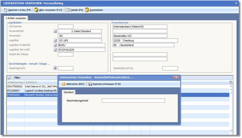 Versandmittel Zusatzdaten erfassen