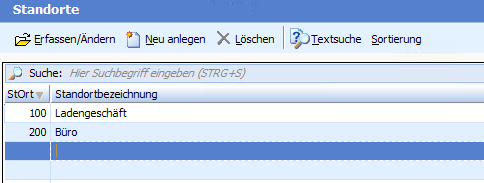 Mit der [F3]-Taste oder dem Button <Neu anlegen> können Sie einen neuen Standort anlegen. Mit der [RETURN]-Taste können Sie einen bestehenden Datensatz bearbeiten.