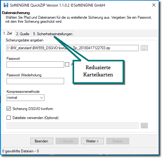 Im Falle einer deaktivierten DSGVO-Option können Sie beispielsweise eine Vorgabedatei anwenden, die spezielle Angaben zur Sicherung enthält. Auch hier sind dann die Registerkarten eingeschränkt.
