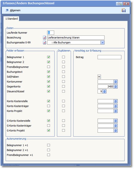 Such- und Ordnungskriterium der Buchungsschlüssel ist die laufende Nummer. Unter dieser Nummer wird der Buchungsschlüssel in der Buchungsmaske aktiviert. Diese Nummer kann vom Anwender frei vergeben werden. Es sind nur Ziffern erlaubt, wobei 999 Buchungsschlüssel definiert werden können.