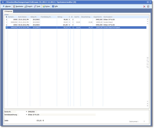 << Hier KLicken um eine Inhaltsübersicht anzuzeigen >> Navigation: Finanzbuchhaltung > Laufende Vorgänge > Stapelbuchungen > Die Karteikarte "Buchungen" > Buchungserfassung > Die Karteikarte "Erfassen/Ändern" > Buchungen bearbeiten - Menü > Primanota |