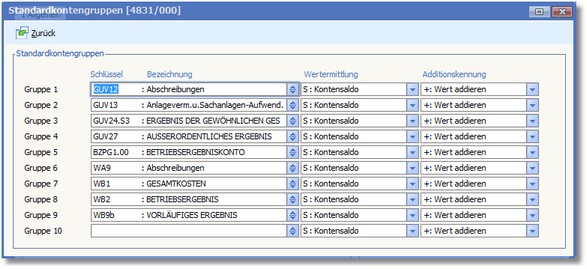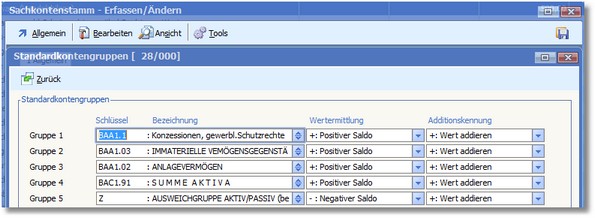 Die Einstellungen der Standardgruppen müssen mit dem ursprünglichen Konto übereinstimmen (Sachkontenstamm - Erfassen/Ändern, Menü "Bearbeiten > Kontogruppen > Standardkontogruppen"):