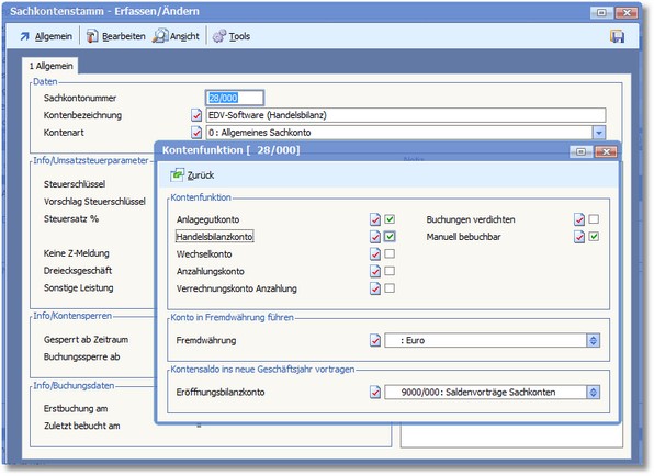 Konto bearbeiten (Menü "Bearbeiten > Kontenfunktion": Kontenfunktion = Handelsbilanzkonto):