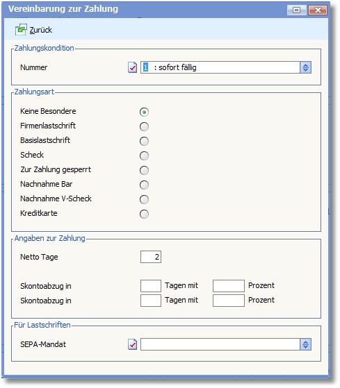 In diesem Dialog können Sie die Zahlungskonditionen für den Offenen Posten bearbeiten: