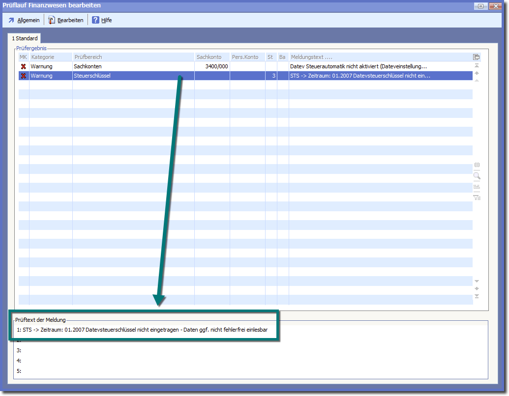 Navigation:  Finanzbuchhaltung > Monatliche/periodische Arbeiten > Finanzbuchhaltung prüfen > Prüflauffehler und deren Bearbeitung > Fehler im DATEV-Prüflauf >