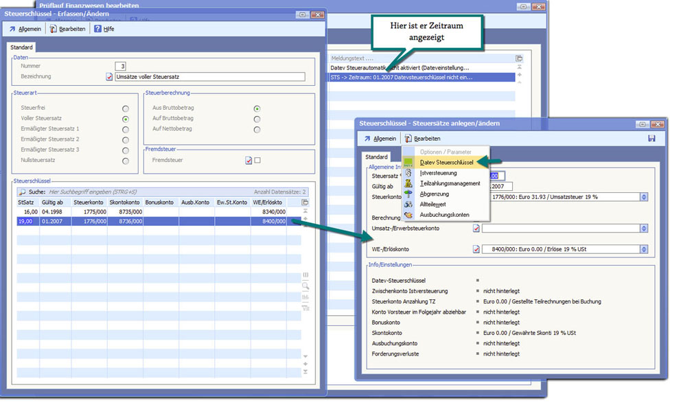 Ist bei einem Steuerschlüssel kein DATEV-Steuerschlüssel eingetragen, erfolgt die entsprechende Fehlermeldung.