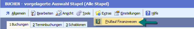 Der Prüflauf kann über das Menü "Extras ➔ Prüflauf Finanzbuchhaltung" in der Stapelauswahl gestartet werden.