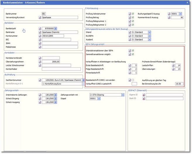 Weiterhin müssen in den Bankstammdaten die Einstellungen für SEPA vorgenommen werden.