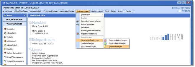 1. Klicken Sie mit der Maus im Hauptmenü auf "Kostenrechnung > Auswertungen > Projektbuchungen".