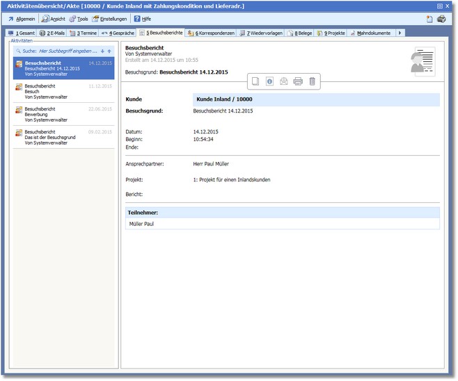 Nach Aktivierung der Karteikarte werden im Bereich "Aktivitäten" jetzt nur noch die der Adresse zugeordneten Besuchsberichte angezeigt.