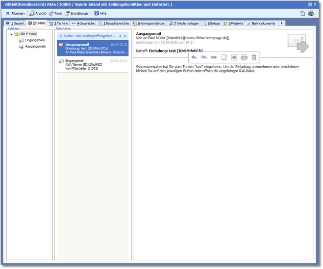 Auf der Karteikarte „2 E-Mails“ sind alle dem Kunden zugeordneten Ein- und Ausgangsmails zu finden. Diese können durch die HTML-Integration direkt aus der Adressakte beantwortet, weitergeleitet, gedruckt etc. werden. Somit hat jeder Mitarbeiter mit entsprechender Berechtigung Zugriff auf alle kundenbezogenen Mails.
